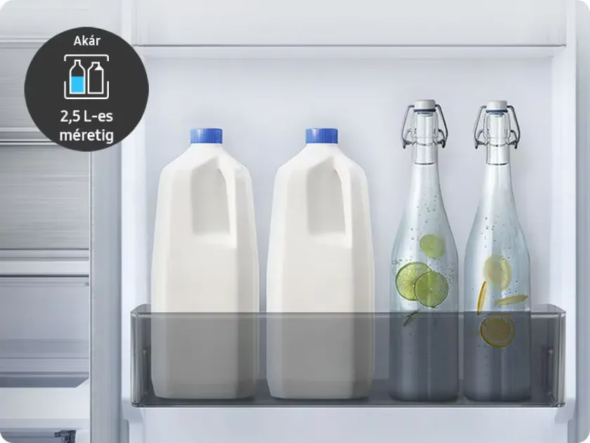 Tárolj nagyobb, akár 2,5 liter méretű üvegeket az ajtóban, hogy a polcokon több hely maradjon másnak! Az ajtóban lévő szélesebb és mélyebb tárolórekesz segítségével biztonságosan tárolhatsz széles kartonokat vagy nagy üvegeket. Tökéletes ahhoz, ha könnyen el szeretnéd érni a kedvenc, hűtött italaidat.