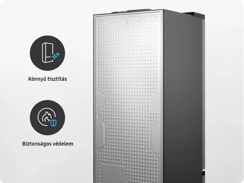 Tisztítsd könnyedén a hűtőd hátulját! A "Teljesen sík hátlap" egy teljesen sima biztonsági borítás a hátul elhelyezkedő csövek és kábelek számára. Letisztult formavilág, könnyen tisztára törölhető és tartósabb is. Ezen felül megakadályozza a szennyeződések felhalmozódását az alkatrészek körül, és megvédi azokat a fizikai behatásoktól.