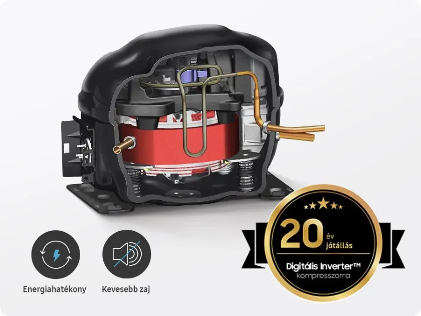 Élvezd a nagy energiahatékonyságot, az alacsony zajszintet és a hosszan tartó teljesítményt! A digitális inverter kompresszor automatikusan beállítja a sebességet a hűtési igényeknek megfelelően. Így csendes, energiahatékony és tartós, ezért tudunk a kompresszorra adott 20 év garanciával* jutalmazni.
