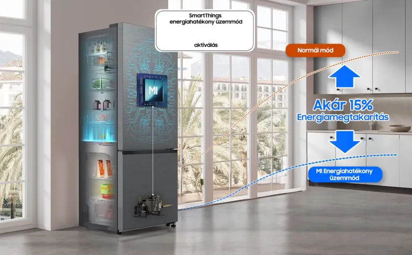 Csökkentsd energiafelhasználásod az energiahatékony üzemmóddal**. Ha a becsült villanyszámlád meghaladja az előre beállított célértéket, akkor a hűtő lehetőséget biztosít az energiatakarékos üzemmódra***. Optimalizálja a kompresszor fordulatszámát és a párologtató leolvasztási ciklusát a használati szokásaid és a környezeti hatások alapján.