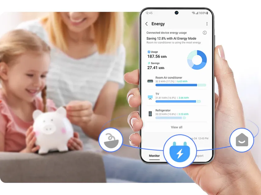 Kezeld az energiafelhasználásod, a szén-dioxid kibocsátás csökkentése és energiaköltségeid megtakarítása érdekében! A SmartThings Energia* energiahatékonysági tippeket ad, emellett valós időben figyeli a háztartási készülékeid** energiafogyasztását, és összehasonlítja azt az előző havi adatokkal. Sőt, figyelmeztet is, ha esetleg túlléped a havi céljaid.