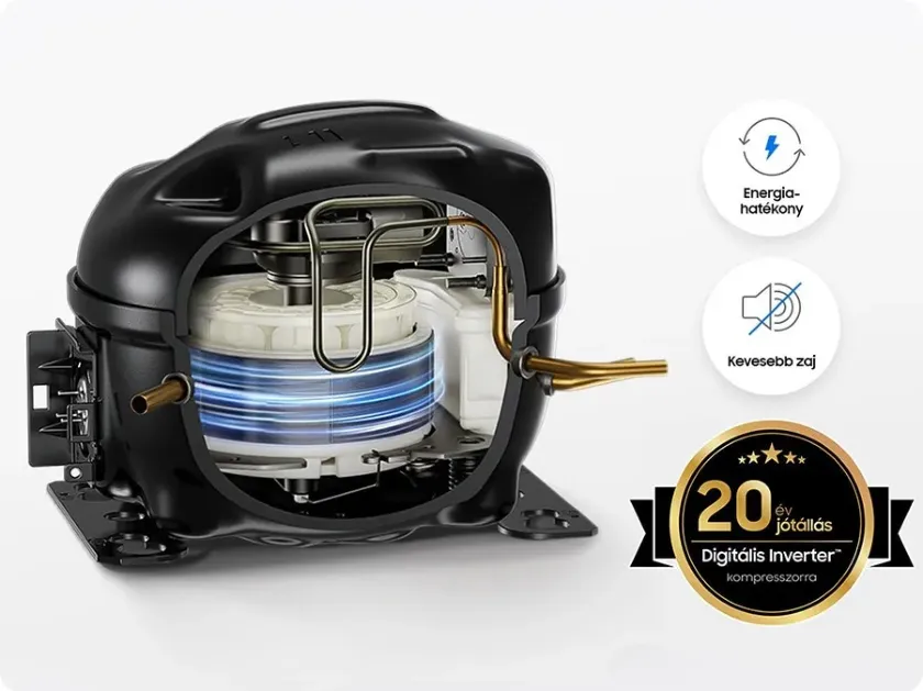 Tartsd egyenletesen hűvösen az élelmiszereket, és takaríts meg energiát! Az AI inverteres kompresszor továbbfejlesztett szerkezetének köszönhetően tehetetlensége 4,1x nagyobb, mint a jelenleg használt kompresszoroké*, így kevesebb energiát használ. AI algoritmus segítségével a használati szokásaidhoz igazítja a sebességét, miközben energiát takarít meg**. A kompresszorra 20 év jótállást vállalunk***.