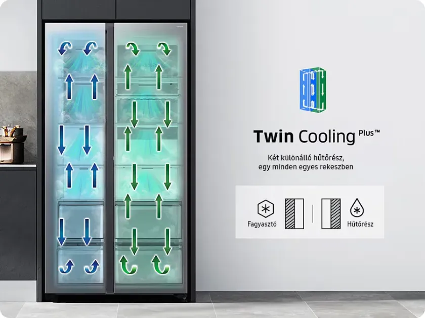 Biztosítja, hogy az élelmiszerek hosszabb ideig őrizzék meg nedvességüket és így maradjanak frissebbek*. A Twin Cooling Plus™ rendszer független párologtatók és ventilátorok segítségével optimalizálja a hőmérsékletet és a páratartalmat a hűtőszekrényben és a fagyasztóban. A legjobb körülmények között őrzi meg az élelmiszereket, és a szagok keveredésének megakadályozásával megóvja azok természetes ízét és aromáját.