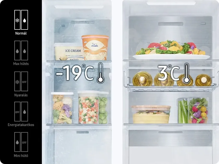 Élvezd a gyors hűtési teljesítményt! Egy gombnyomásra a Gyors hűtés funkció intenzív hideg levegőt fúj a hűtőszekrénybe, hogy gyorsan lehűtse a bevásárlást vagy a kedvenc italaidat. A Gyors fagyasztás funkció pedig a mélyhűtőbe fúj hideg levegőt. Kiválóan alkalmas az ételek fagyasztására és jégkészítésre.