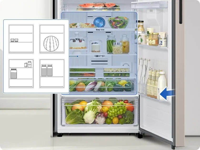 Használd ki a tárolóhelyet, és kapd kézhez gyorsan kedvenc ételeidet és italaidat! Az állítható magasságú polcok a magas palackokhoz, kartondobozokhoz és más, nagyméretű élelmiszerekhez állíthatók. A nagy ajtó rekeszben pedig a tej- és gyümölcslé-dobozokat vagy más, nagy palackokat is tárolhatsz!