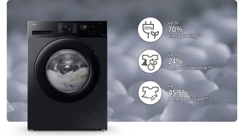 Élvezd a hatékony tisztítást, akár alacsony hőmérsékleten is! Az Eco Bubble™ a mosószerből aktív habot képez, ami gyorsan átjárja a textileket, és akár 24%*-kal könnyebben távolítja el a szennyeződéseket. Emellett akár 70%**-kal kevesebb energiát használ, és védi a ruhák színét és anyagát az akár 45,5%***-kal jobb textil védelemmel****.