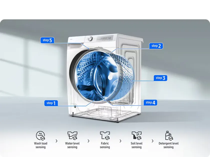 Mosd ki a ruháidat alaposan*, de kíméletesen, kevesebb vízzel és mosószerrel**. Az AI Mosás fejlett érzékelést használ a szövet súlyának és puhaságának érzékelésére, és folyamatosan figyeli a szennyezettségi szintjét is. Ezután intelligensen optimalizálja a víz és a mosószer mennyiségét, valamint az áztatást, az öblítést és a centrifugálást.