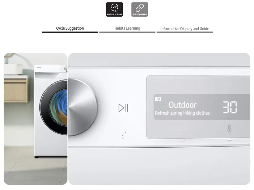 Moss egyszerűen és hatékonyan az AI vezérlés segítségével! Az AI vezérlés személyre szabja a mosást azáltal, hogy emlékszik a mosási szokásaidra, ciklusokat javasol, és megjeleníti a várható időtartamot. A SmartThings applikáció* tanácsokat ad a ciklusokkal és tervezéssel kapcsolatban, valamint a hibaelhárításban is segít. Ráadásul automatikusan kiválasztja a tökéletes szárítási funkciót is**.