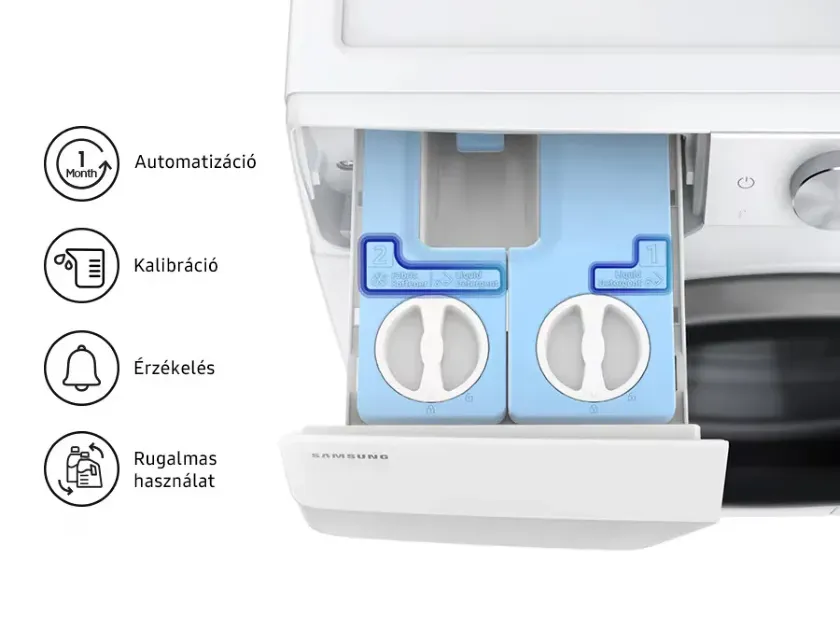 * Egy mesterséges intelligencia által létrehozott algoritmus alapján. A tényleges eredmények az egyéni használat függvényében eltérhetnek.** Az AI Mosás akár 1 hónapnyi mosásra elegendő mosószert képes tárolni, heti 4 töltés átlaga alapján. A mosási töltéstől és a beállításoktól függően eltérhet.