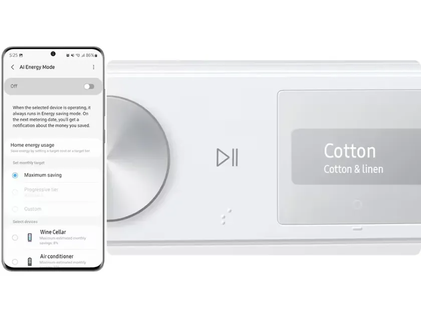 * Elérhető Android és iOS eszközökön. Wi-Fi kapcsolat és Samsung fiók szükséges.** Akkor alkalmazható, ha a kiválasztott mosási hőmérséklet 20~40°C.*** A WW11BB944AGB modellen végzett belső tesztelés alapján, normál használati körülmények között. Eredmények: Energiafogyasztás AI Energia üzemmód nélkül = 0,539 KWh. Energiafogyasztás AI Energia üzemmóddal = 0,145 KWh. Az eredmények a tényleges használati körülményektől függően változhatnak.