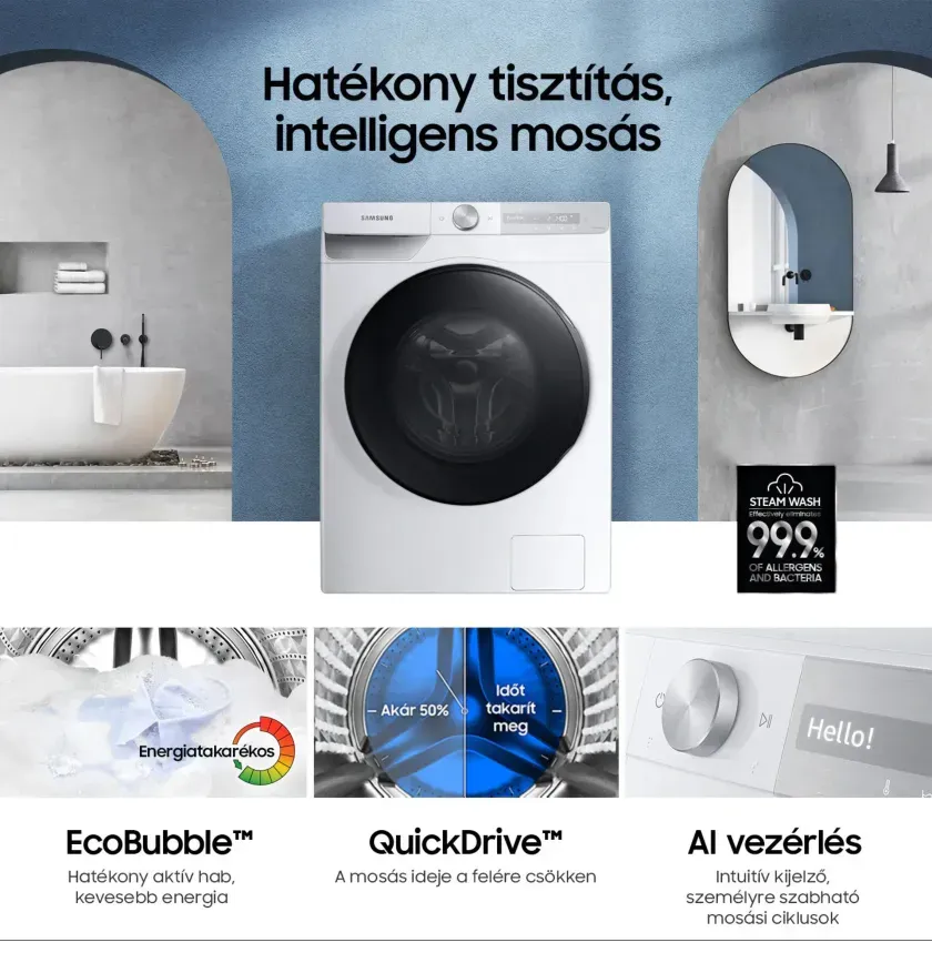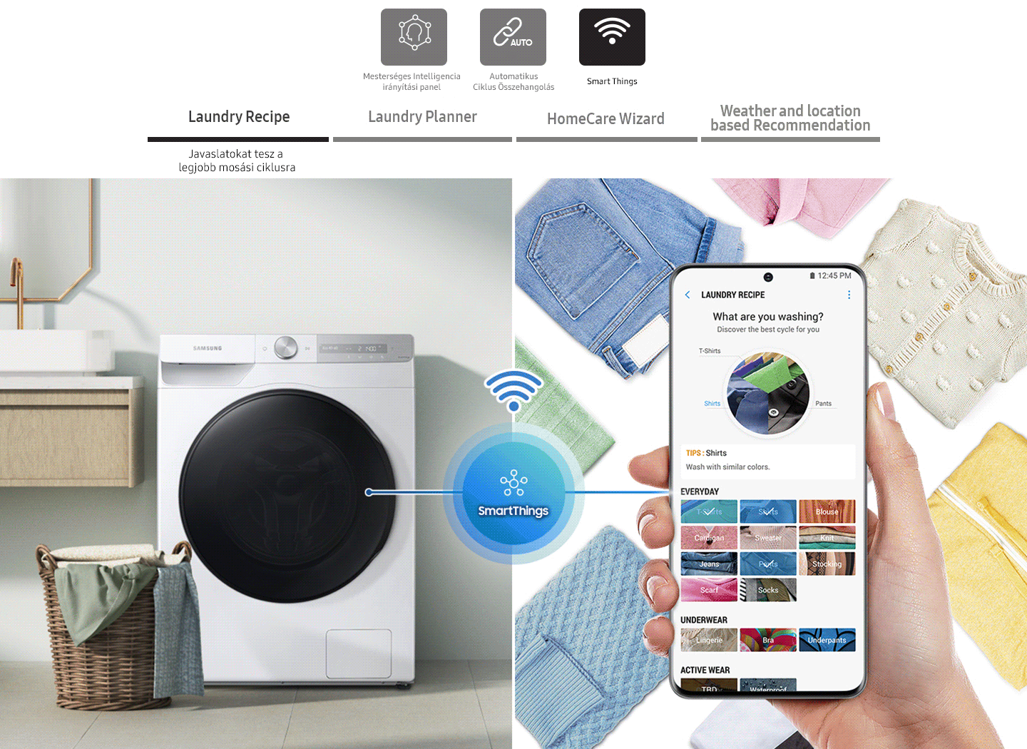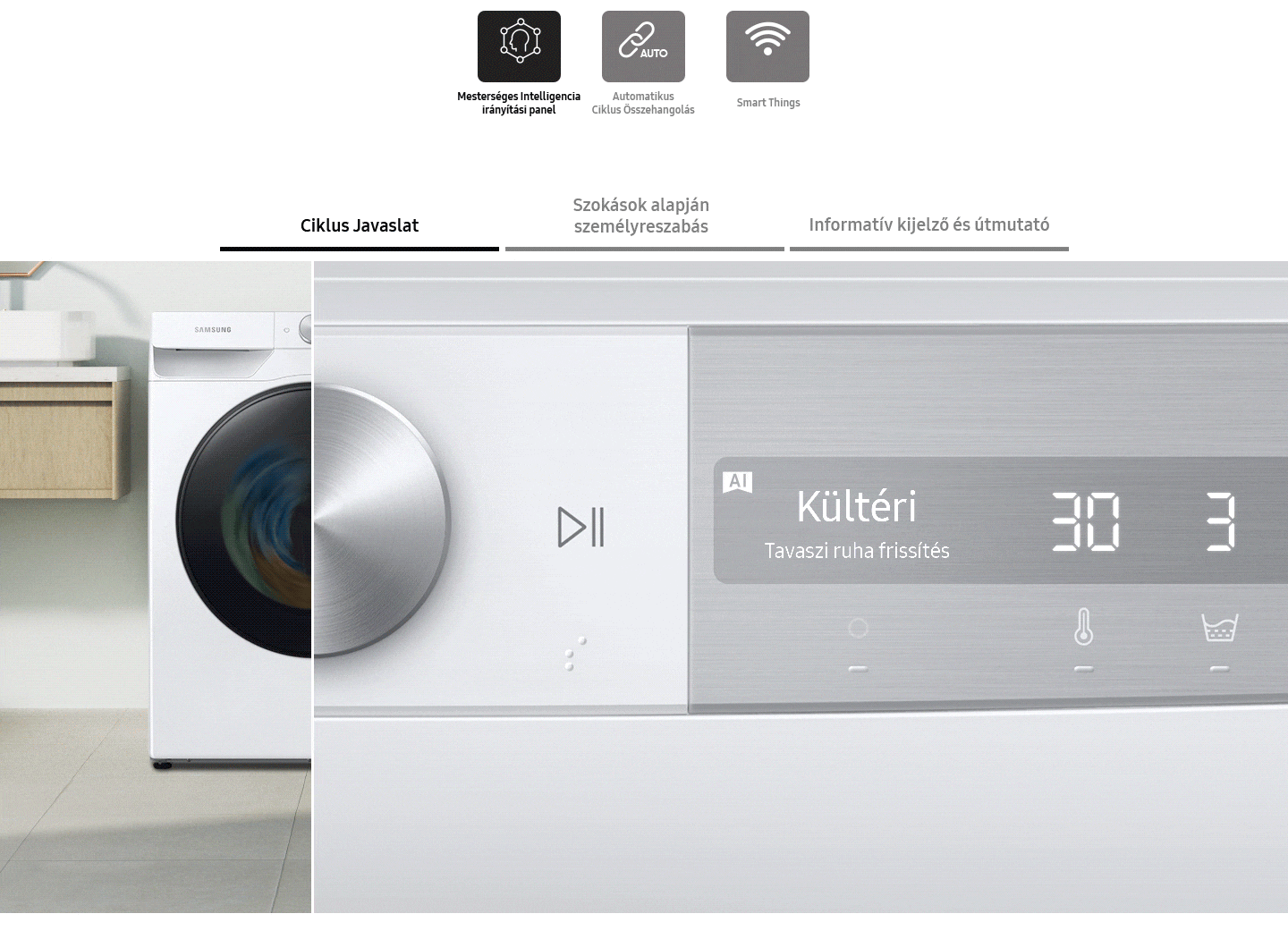 Mosd ruháidat könnyen és hatékonyan az erős AI (Mesterséges Intelligencia) vezérlés segítségével! A mosási szokásaid alapján személyre szabott szárítást nyújt, mosási ciklusokat javasol és kijelzi a mosási idővel kapcsolatos információkat. A SmartThings alkalmazás* mosási ciklusokkal kapcsolatos tanácsokat ad, tervez és a hibaelhárításban is segít, valamint kiválasztja a mosási ciklusnak leginkább megfelelő szárítást**.
