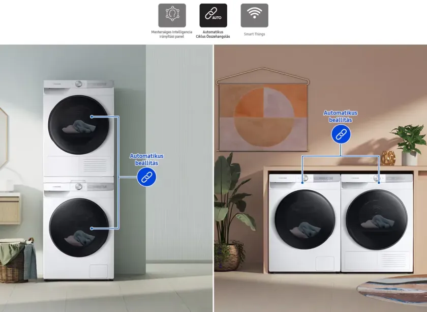 *Android és iOS eszközökön érhető el. Wi-Fi csatlakozás és Samsung fiók ("Samsung Account") regisztráció szükséges hozzá. **Az Automatikus Ciklus Összehangolás kizárólag akkor érhető el, ha a mosógép és a szárítógép is rendelkezik MI-vel (Mesterséges Intelligenciával) és Wi-Fi kapcsolattal. A képek eltérhetnek a valós terméktől. A mobil grafikus felhasználói felület (angolul "Graphical User Interface"; nemzetközileg ismert rövidítése: "GUI") képei országonként és régiókként eltérhetnek.