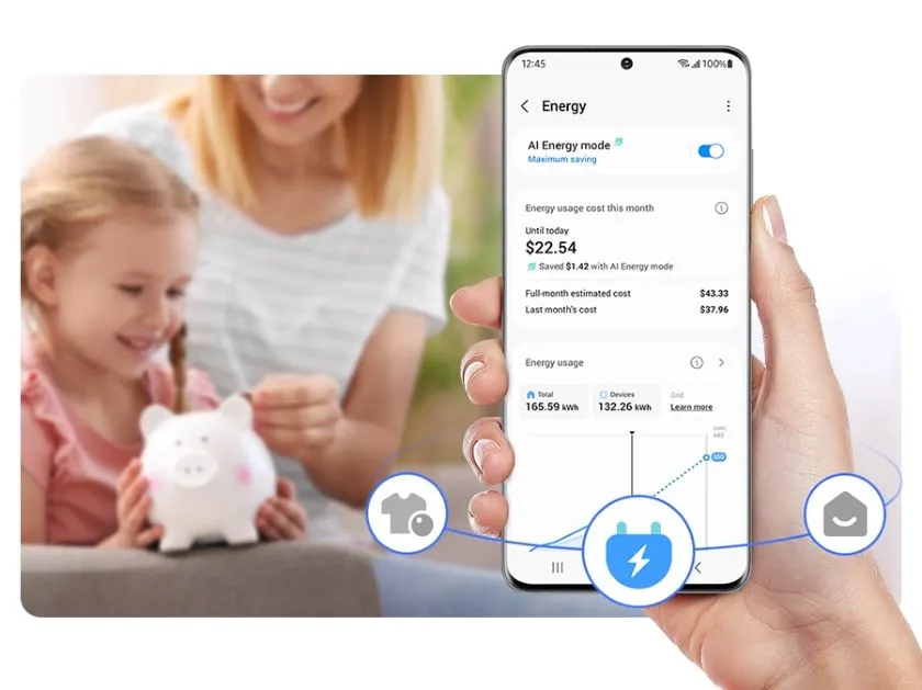 * Elérhető Android és iOS eszközökön. Wi-Fi kapcsolat és Samsung-fiók szükséges.** A SmartThings Energy üzemmód jelenleg mintegy 40 SmartThings-kompatibilis Samsung háztartási készülékkel működik együtt. Ezek közé tartoznak mosógépek, ruhaszárítók, mosogatógépek, légkondicionálók, légtisztítók, porszívók, sütők, páraelszívók, főzőlapok, mikrohullámú sütők, tévék (2022 júniusától) és energiamérők.