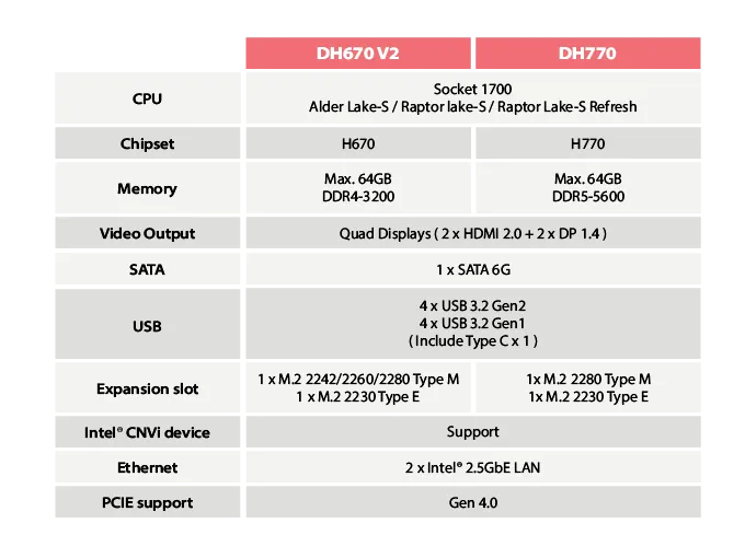 Az Intel® UHD Graphics és a kétcsatornás DDR5-5600 támogatás révén a DH770 nagyobb grafikus teljesítményt, gyorsabb memóriaelérést és erőteljes többfeladatos működést tesz lehetővé. Kimagaslóan teljesít AIoT Edge feladatokban, kristálytiszta videostreamelésben, és sokféle erőforrás-igényes feladatban. Kompakt mérete széles I/O csatlakozókínálatot rejt: HDMI 2.0, DisplayPort 1.4, USB 3.2, COM (RS232/422/485), SATA 3.0, M.2 SSD, két 2,5G LAN és WLAN bővítés. Legyen szó 4 kijelzős videofalról, interaktív digitális tábláról, NVR állomásról vagy automatizálási vezérlésről, a DH770 sokoldalúságot és megbízhatóságot biztosít különféle iparágakban.