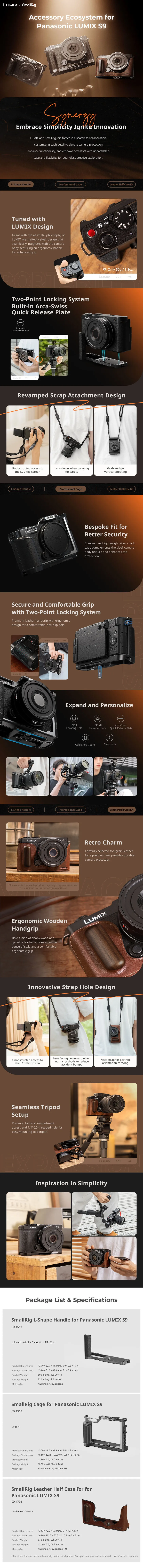 A SmallRig Cage for Panasonic LUMIX S9 4515 a kamera védelmére készült, és több rögzítési lehetőséget ad a tartalomkészítéshez. A minimalista, ezüst-fekete kialakítás harmonikusan illeszkedik a kamerához. A váz alul egy 1/4"-20 csavarral, jobb oldalt pedig egy oldalsó rögzítővel stabilizálható. Több ponton találhatók beépített szilikonbetétek, amelyek megakadályozzák a gépváz karcolódását. A beépített ergonomikus markolat javítja a fogást és a kezelés kényelmét. A cage nem zavarja a gombok, a kártyafoglalatok, a kijelző, az akkumulátorrekesz és más csatlakozók használatát. A vázon több rögzítési pont található: 1/4"-20 menetes furatok, ARRI 3/8"-16 pozicionáló furat, vakupapucs, pántnyílás, stb. A konfiguráció bővíthető többek között 2756B markolattal, 3487 mikrofonnal, LED lámpával, 3848 pánttal és más kiegészítőkkel videós tartalom készítéséhez. Az alján található egy beépített Arca gyorscseretalp a közvetlen Arca-típusú állványrögzítéshez, valamint egy beépített kétfejű kulcs, amely segít a gyors szerelésben és szétszerelésben.