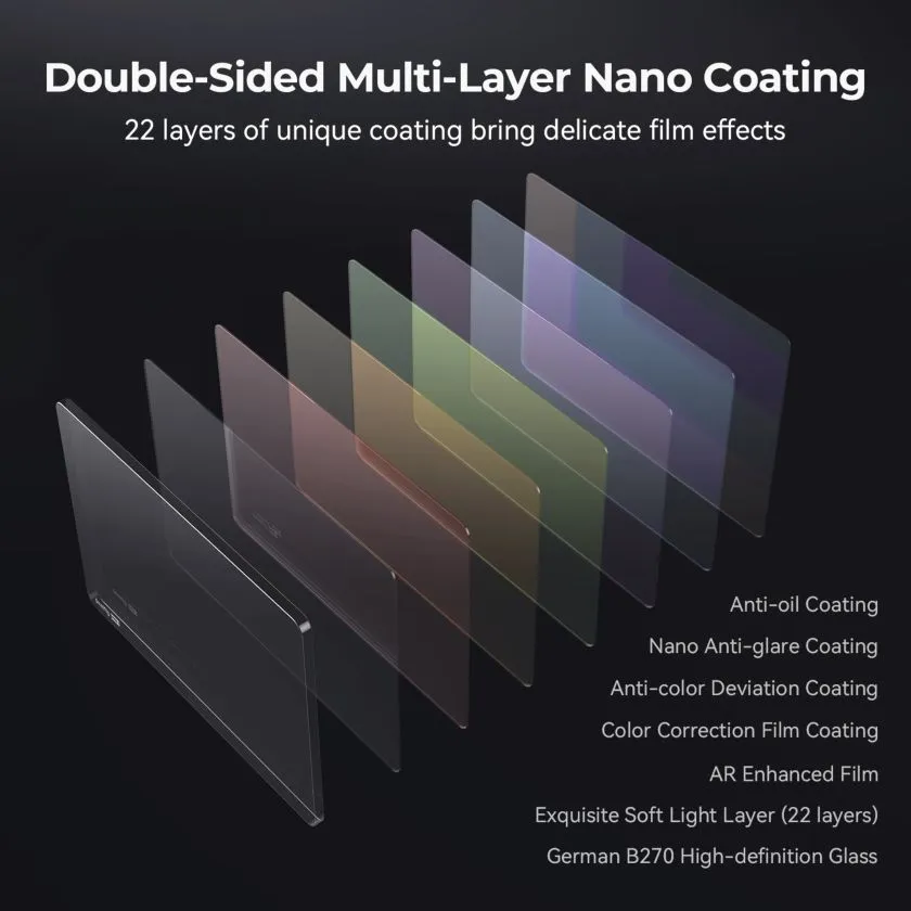 Az importált üvegből és egyedi, finom részecskéket tartalmazó közbenső rétegszerkezettel készült Black Diffusion Filter egy szabadalmaztatott, többrétegű színkorrekciós fóliát alkalmaz a színtorzítások szabályozására. Ez a nano tükröződésmentes és foltmentes bevonatokkal, valamint a kétoldalas, 22 rétegű bevonó eljárással ellátott szűrő hatékonyan elnyomja a felületén lévő közvetlen és ferde fényforrások által okozott tükröződést, kiemelve az árnyékok részleteit. Biztosítja a színkonzisztenciát a különböző fokozatokon, és precíziósan polírozott élekkel büszkélkedhet az optimális teljesítmény érdekében.