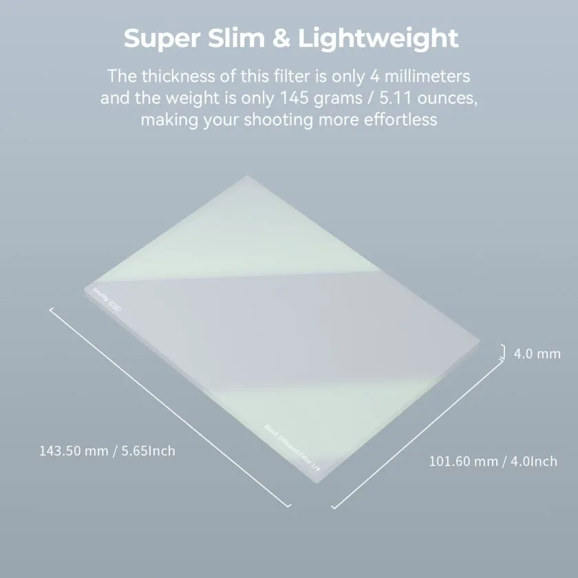 A Black Diffusion Filter figyelemre méltó a penész-, víz-, olajfolt- és éles tárgyak okozta karcolásállósága miatt, könnyen tisztítható és kényelmesen tárolható. Szabványosított 4 x 5,65"-os méretei lehetővé teszik a kompatibilitást a piacon általánosan kapható 4 x 5,65"-os matt dobozokkal.