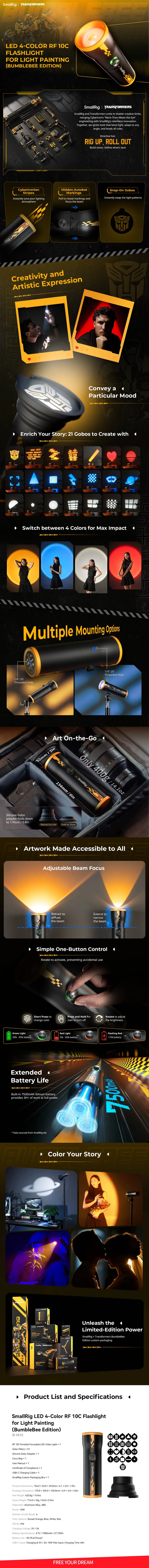 A SmallRig RF 10C Portable Focusable LED Video Light „BumbleBee Edition” 5512 a SmallRig hordozható világítási ökoszisztémájának szerves része. Alumíniumötvözetből készült, sötét színvilágú háza elegáns és strapabíró, miközben kompakt és könnyű kialakítása miatt könnyedén elfér bármely fotós hátizsákban.