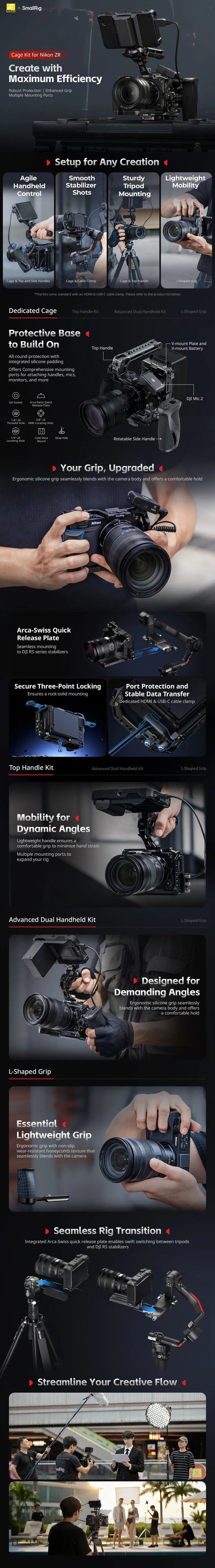 A SmallRig Cage Kit for Nikon ZR (Advanced Edition) 5468 professzionális kézből történő használatot, átfogó kameravédelmet és sokoldalú bővítési lehetőségeket biztosít. Az ergonomikus, szilikonborítású felső markolat csúszásmentes, hidegálló fogást kínál, amely kényelmes és stabil kézből történő használatot tesz lehetővé. Emellett a formázott oldalsó markolat egyérintéses szögállítással támogatja az optimális kamerakezelést, elősegítve a folyamatos felvételkészítést, miközben csökkenti a hosszan tartó használat során jelentkező terhelést. A dedikált HDMI- és USB-C-kábelrögzítő biztosítja a stabil csatlakozást a megszakításmentes adatátvitelhez.