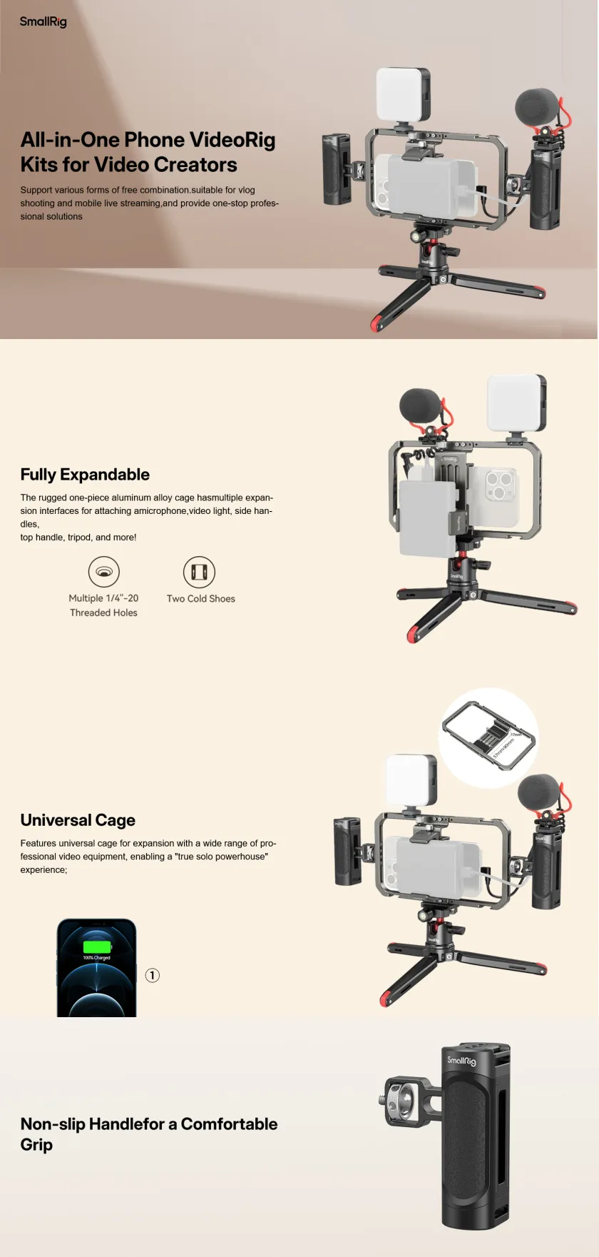 A SmallRig All-in-One Video Kit For Smartphone Creators with Audio and Lighting System 3384C átfogó megoldást kínál professzionális okostelefonos videófelvételekhez. A készlet tartalmaz egy univerzális okostelefon-tartót, két oldalsó fogantyút, egy fém asztali állványt, egy puskamikrofont, egy kétszínű LED-lámpát, egy powerbank-rögzítőt, egy 2 az 1-ben USB-C PD gyorstöltő és audio adaptert, valamint egyéb tartozékokat. Az univerzális cage több 1/4"-20 menetes furattal és vakupapucs-rögzítéssel rendelkezik, így számos professzionális videoeszközzel bővíthető. A mikrofon egy 3,5 mm - Type-C csatlakozón keresztül csatlakozik, ami tömörebb. Az irányított kardioid hangfelvétel tiszta és független videóhangzást biztosít, blokkolva a háttérzajt. Kettős színhőmérsékletű mini LED lámpa, beépített akkumulátorral, akár 2,5 órás akkumulátor-üzemidővel. Hideg és meleg színhőmérséklet-szabályozás, különféle fényhatás-módok szimulálásával. Kis asztali fém állvány, 360°-os panorámafej Arca gyorskioldó lemezzel, masszív és tartós konstrukció.
