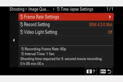 A kamerán belüli timelapse funkció lehetővé teszi, hogy magán a kamerán belül készíts timelapse videókat. Az expozíciós intervallum 1 másodperctől 60 másodpercig állítható, így a lassú akciókat könnyen élvezetes timelapse-sorozatba sűrítheted. Ha egy kompatibilis videolámpát (külön megvásárolható) csatlakoztatsz a kamerához, akkor az úgy állítható be, hogy minden egyes expozíció előtt közvetlenül bekapcsoljon, így a timelapse sorozatokat gyenge fényviszonyok mellett is rögzítheted.