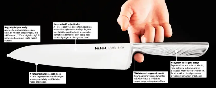 Fedezze fel a Precision-t, a Tefal legélesebb késkollekcióját, és élvezze a tökéletes és pontos vágást minden alkalommal. Ez egy olyan konyhakés, amely könnyedén megbirkózik bármilyen alapanyaggal - mindezt tökéletes eleganciával! Élvezze a kifinomult vonalakat és a végtelen kényelmet a kezében. A kizárólag német rozsdamentes acélból készült és speciális jeges edzési eljárásunkkal kezelt Precision kések hosszú távú teljesítményt, kivételes tartósságot és korrózióállóságot garantálnak.