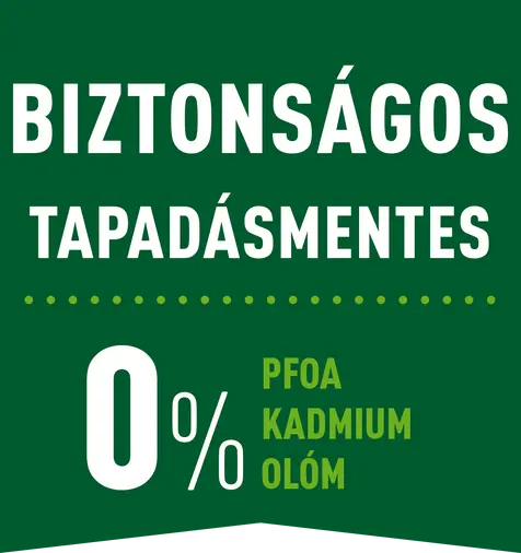 Az egészséges főzés melletti elkötelezettségünk keretében az általunk gyártott tapadásmentes felületek nem tartalmaznak PFOA-t, ólmot vagy kadmiumot. A vizsgálatokat külső, független laboratóriumok végezték, az élelmiszerekkel való érintkezésre vonatkozó jelenlegi előírásoknál szigorúbb feltételekkel.