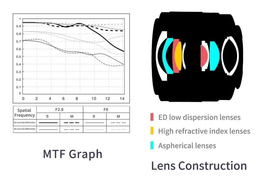 Az optikai felépítés 10 lencsetagot tartalmaz 8 csoportban, köztük 2 ED lencsét, 1 nagy törésmutatójú lencsét, 2 aszférikus lencsét, nagy felbontású nano többrétegű bevonatot, valamint a frontlencsén vízálló és szennyeződésgátló bevonatot.