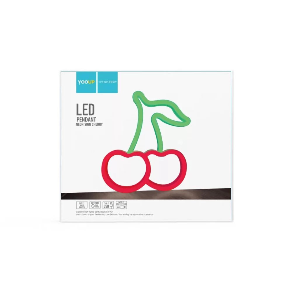 A cseresznye motívum mérete (19,5x1,6x22,5 cm) ideális fali használatra; mindössze 1,6 cm-es mélységének köszönhetően a dekoráció elegánsan illeszkedik a felülethez. A YOOUP energiatakarékos és biztonságos LED technológiát használ a hagyományos gázneon helyett, amely hosszú élettartamot és minimális hőtermelést garantál, míg a fényhatás a klasszikus, élénk neon vizuális erejét adja. A YOOUP Cherry neonnal a játékosság, a stílus és a technikai kényelem egyetlen, lenyűgöző díszítőelemben találkozik, amely a falát személyes, vidám stílusának kifejeződésévé varázsolja.