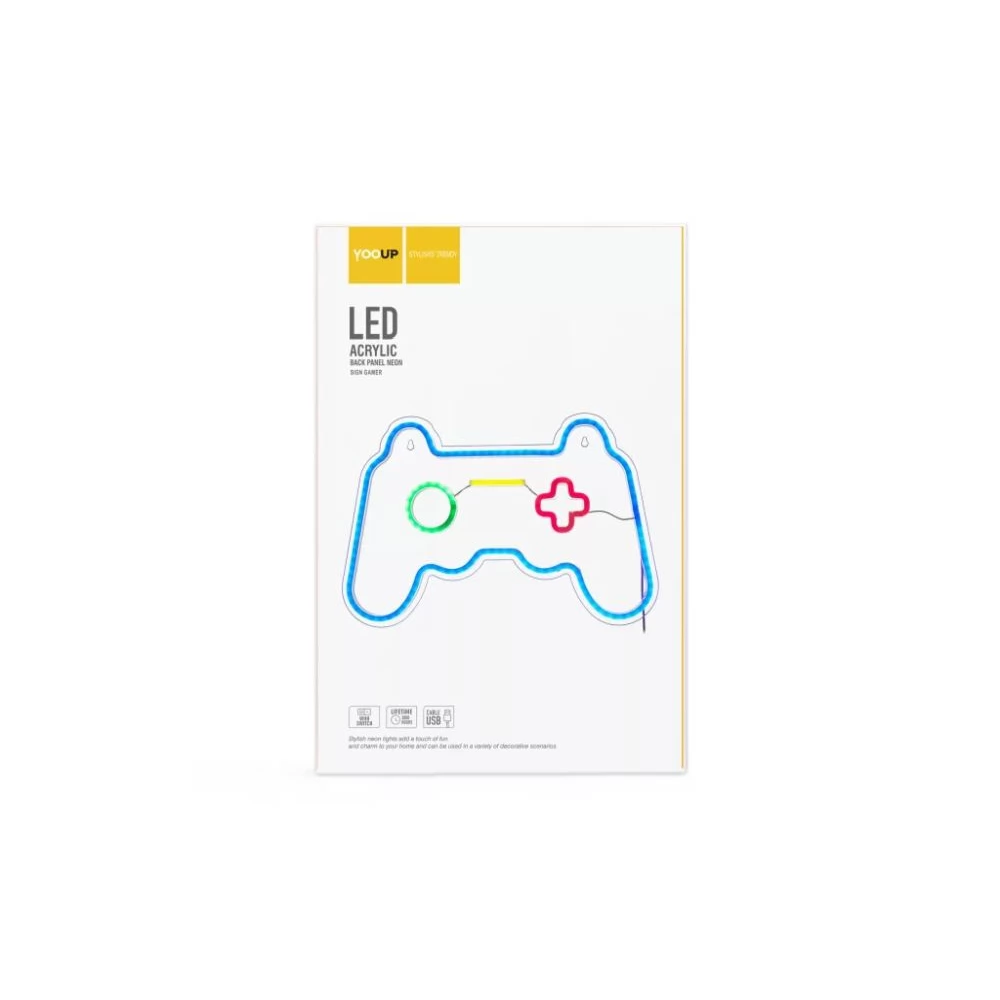 Széles, impozáns méretének (41x1,6x27,5 cm) és mindössze 1,6 cm mélységének köszönhetően a kontroller motívum ideális fali használatra, és elegánsan illeszkedik a felülethez. A tartós plexi hátlap nemcsak stabil tartást biztosít a neoncsöveknek, hanem letisztult, modern megjelenést is kölcsönöz nekik. A YOOUP energiatakarékos és biztonságos LED technológiát használ a hagyományos gázneon helyett, ami hosszú élettartamot és minimális hőtermelést garantál, míg a fényhatás a klasszikus, élénk neon vizuális erejét adja. A YOOUP játékkonzol neonjával a játék, a minőség és a technikai kényelem egyetlen, lenyűgöző díszítőelemben találkozik, amely a faladat fiatalos, vagány stílusod kifejezőjévé varázsolja.