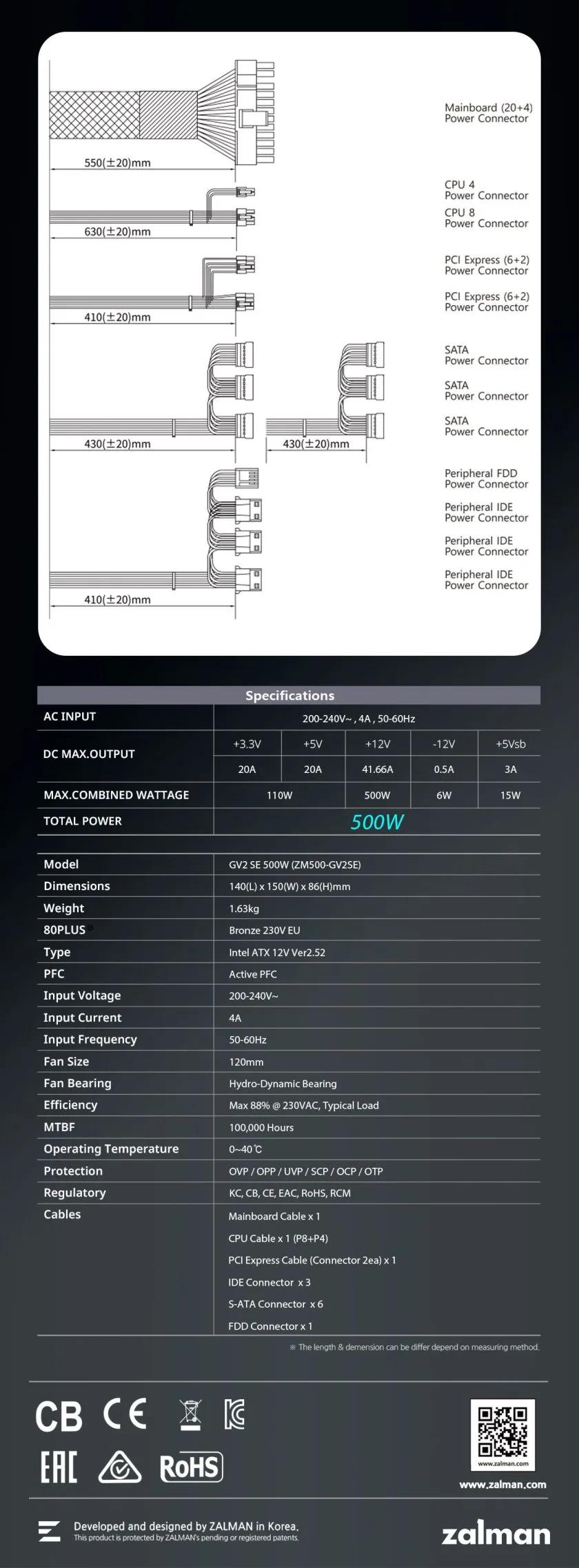 A 80PLUS Bronze 85%, 88%, 85%-os hatékonyságot garantál 20%, 50% és 100%-os terhelési rátával, jelentősen csökkentve a rendszer teljes energiafogyasztását. A tápegység magasabb hatékonysága azt jelenti, hogy kevesebb az áramszivárgás, ami kevesebb hőt, nagyfrekvenciás zajt és ventilátorzajt jelent.