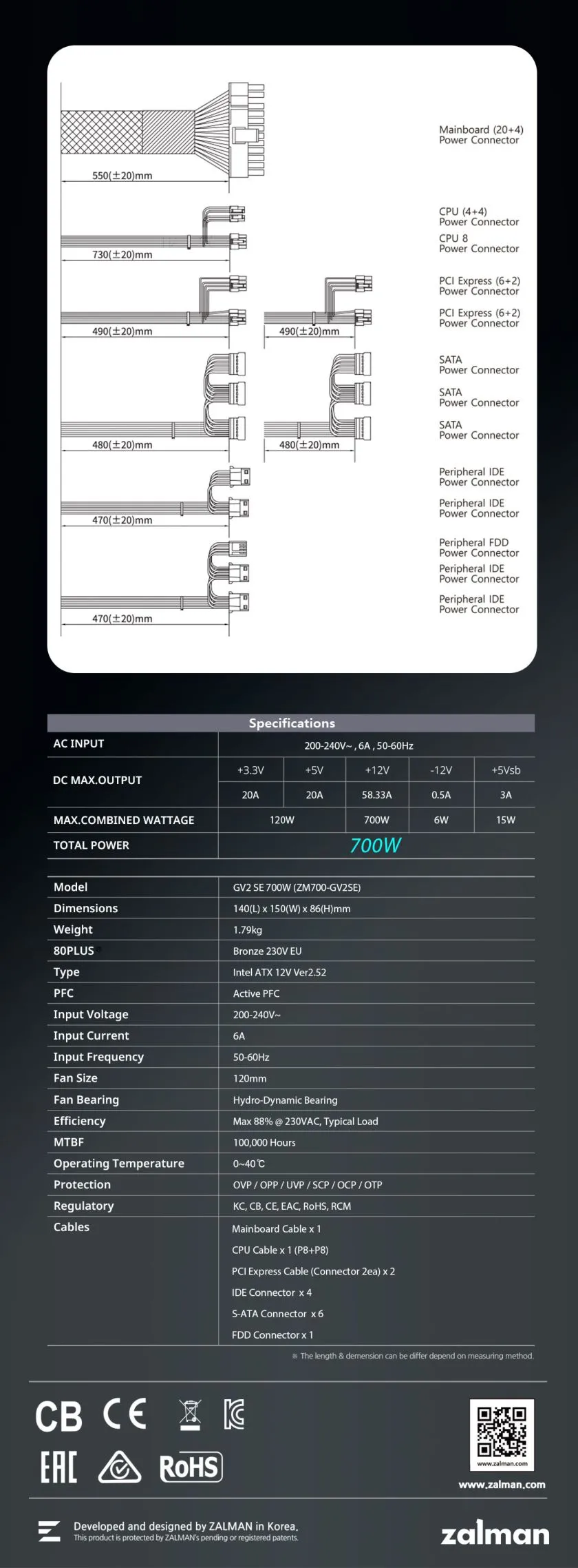 A 80PLUS Bronze 85%, 88%, 85%-os hatékonyságot garantál 20%, 50% és 100%-os terhelési rátával, jelentősen csökkentve a rendszer teljes energiafogyasztását. A tápegység magasabb hatékonysága azt jelenti, hogy kevesebb az áramszivárgás, ami kevesebb hőt, nagyfrekvenciás zajt és ventilátorzajt jelent.