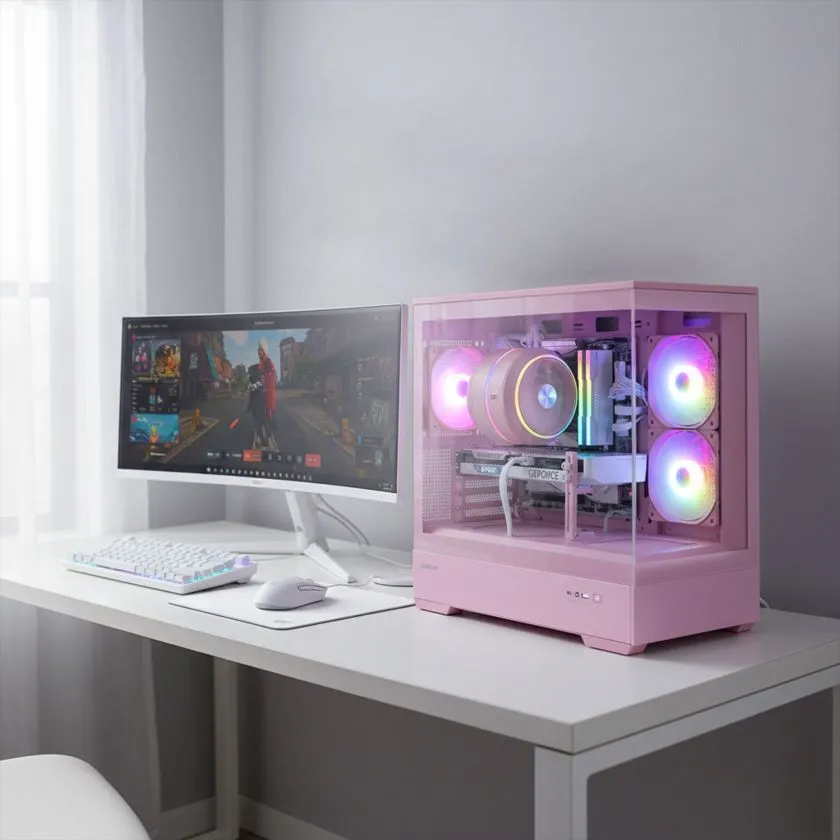 Két keret nélküli elülső és oldalsó edzett üveg mutatja be az egyedi PC-felépítést