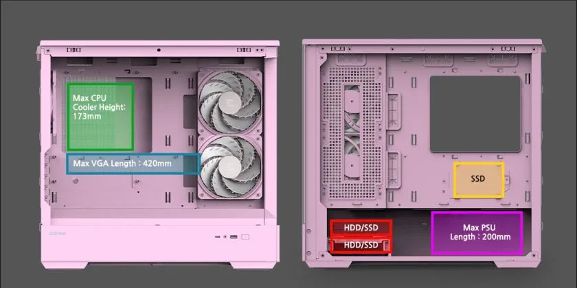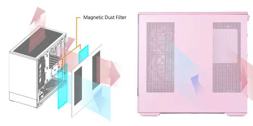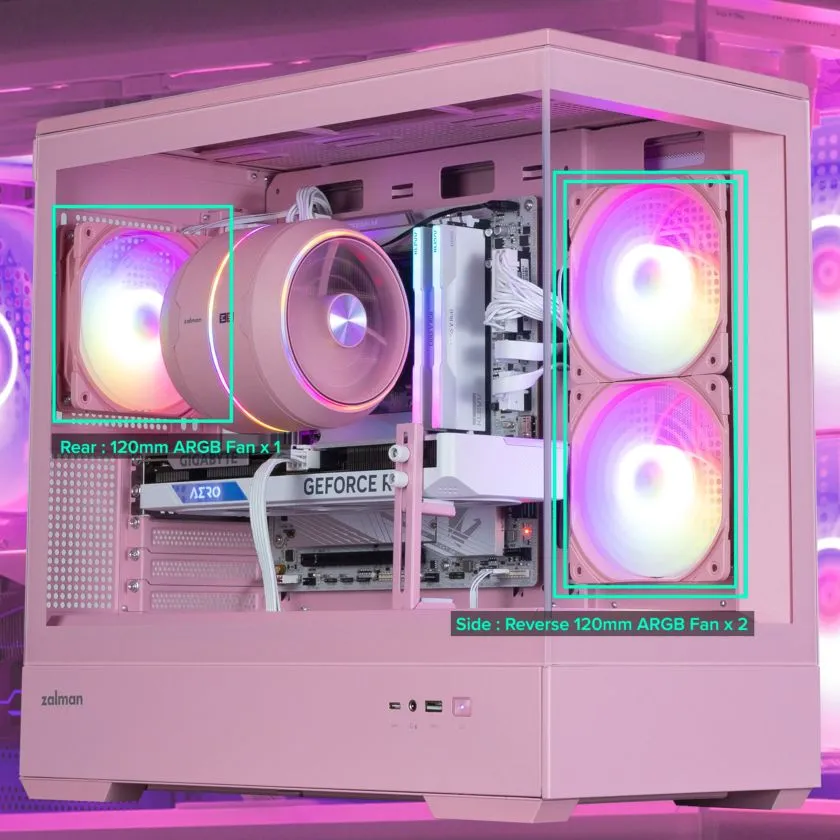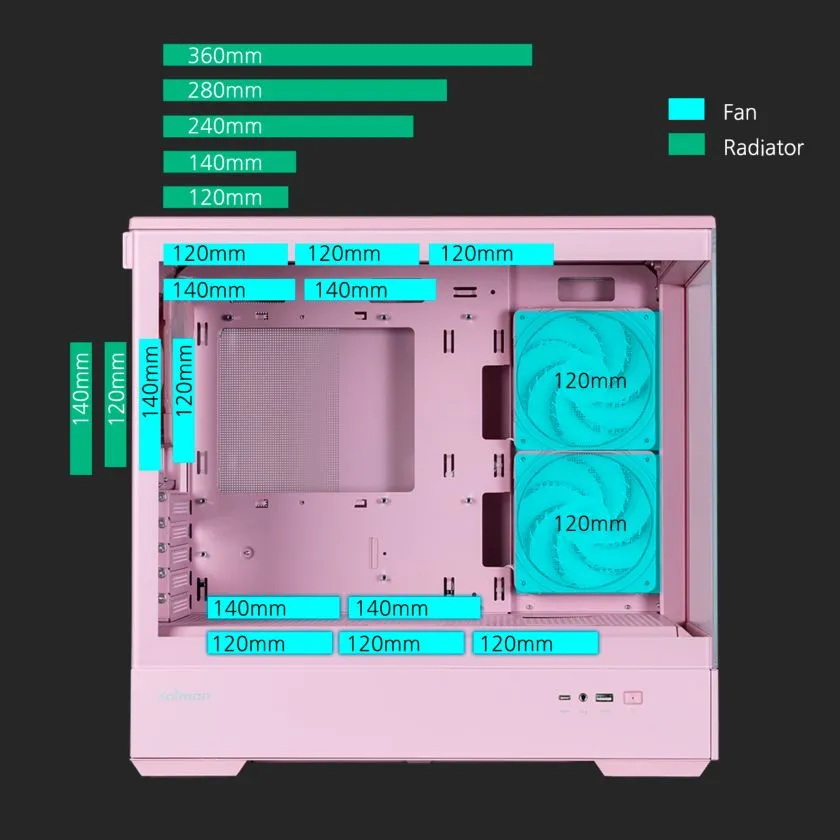 Az oldalsó két 120mm-es visszafelé forgó ventilátor hatékonyan szívja be a friss levegőt kívülről a házba, míg a hátsó ventilátor forró levegőt fúj ki a légáramlás és a hűtési teljesítmény maximalizálása érdekében.