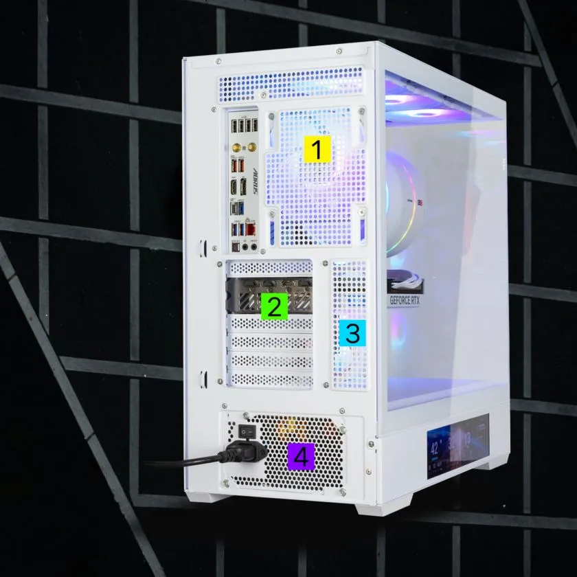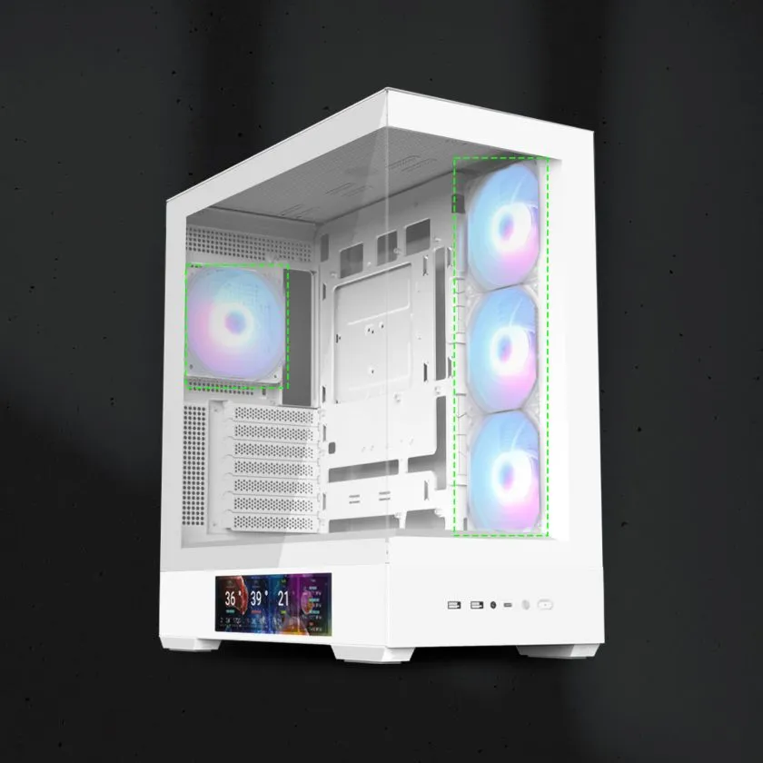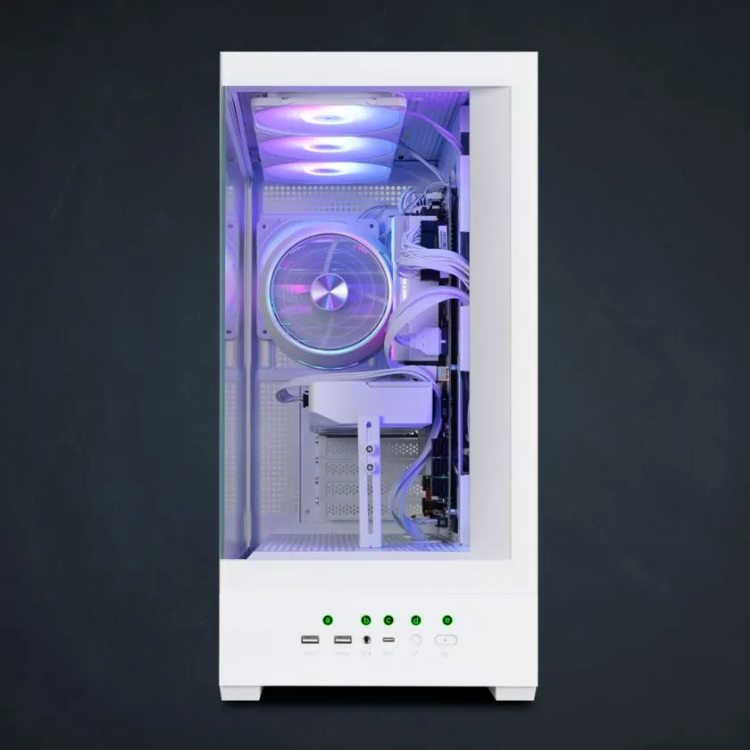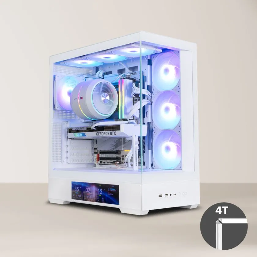 Két keret nélküli edzett üvegpanel (elöl és oldalt), amely bemutat egy lenyűgöző PC-összeállítást