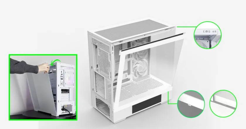 Az oldalpanel könnyen és teljesen eltávolítható a PC-alkatrészekhez való kényelmes hozzáférés érdekében.