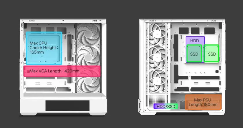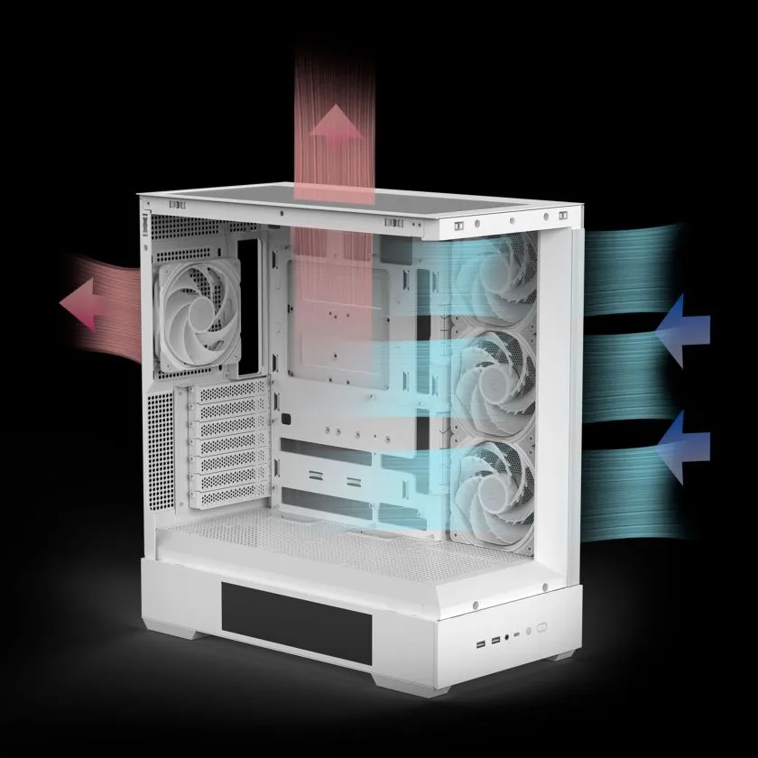 A legjobb hűtési megoldást biztosítja az oldalsó szívónyílás kialakítást optimalizált ventilátorelhelyezéssel kombinálva a kiváló belső légáramlás érdekében.