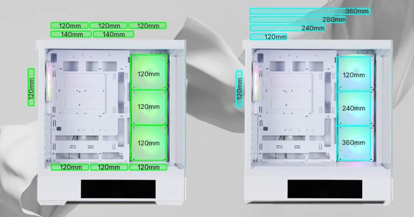 Felül/oldalt 360 mm-es radiátorok támogatása