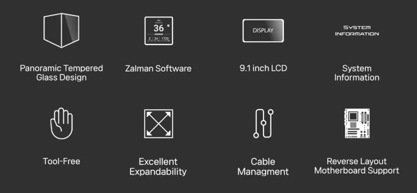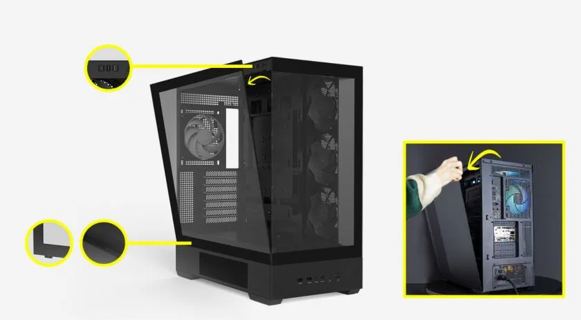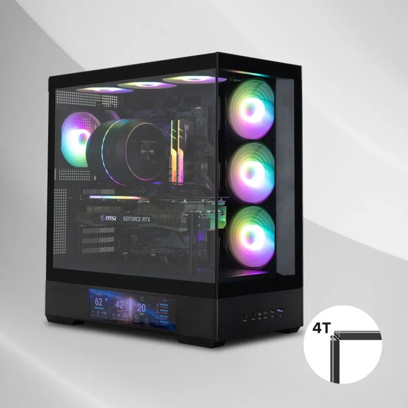 Két keret nélküli edzett üvegpanel (elöl és oldalt), amely bemutat egy lenyűgöző PC-összeállítást