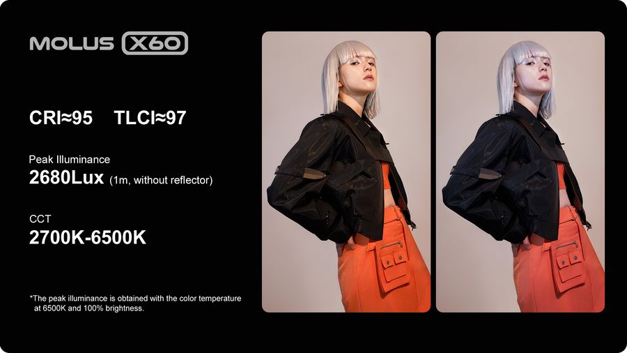 Erős és stabil 60 W-os világítási teljesítményt biztosít, pontosan visszaállítja a tárgyak valódi színét, nyugodtan megbirkózik a különféle felvételi igényekkel összetett jelenetekben.
